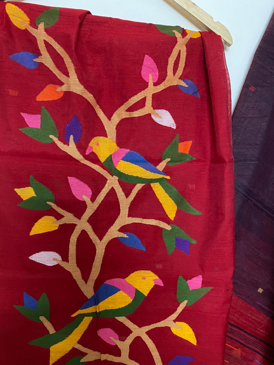 Red Handloom Jamdani Chanderi Cotton by Silk Two Piece Unstitched Suit Set
