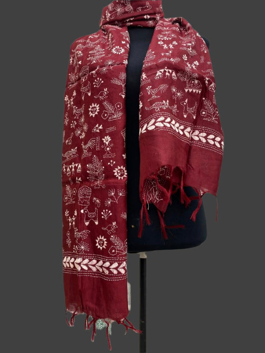 Mehroon - Bengal Kantha Embroidery Handloom Tussar Silk Stole