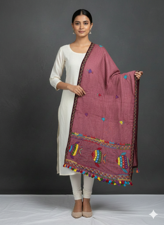 Wine - Handcrafted Lambani Khadi Cotton Stole with Multicolor Embroidery and Mirror Work
