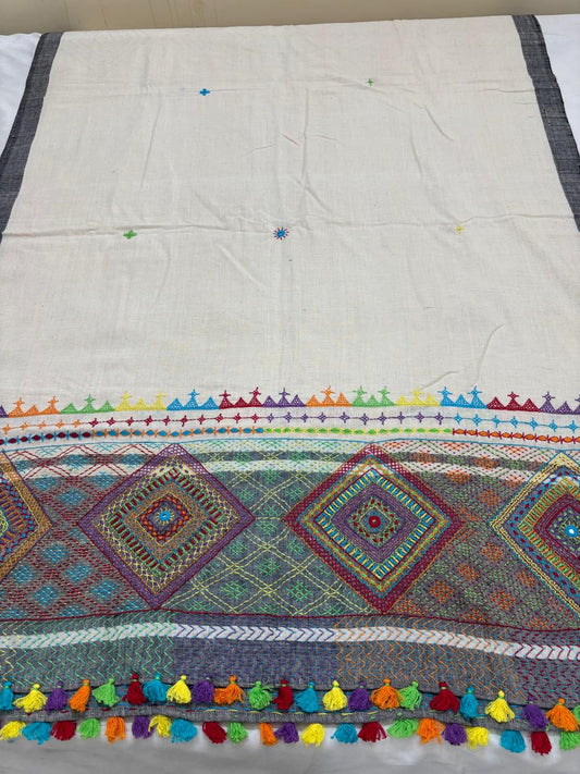Wine Handcrafted Lambani Khadi Cotton Stole with Multicolor Embroidery and Mirror Work