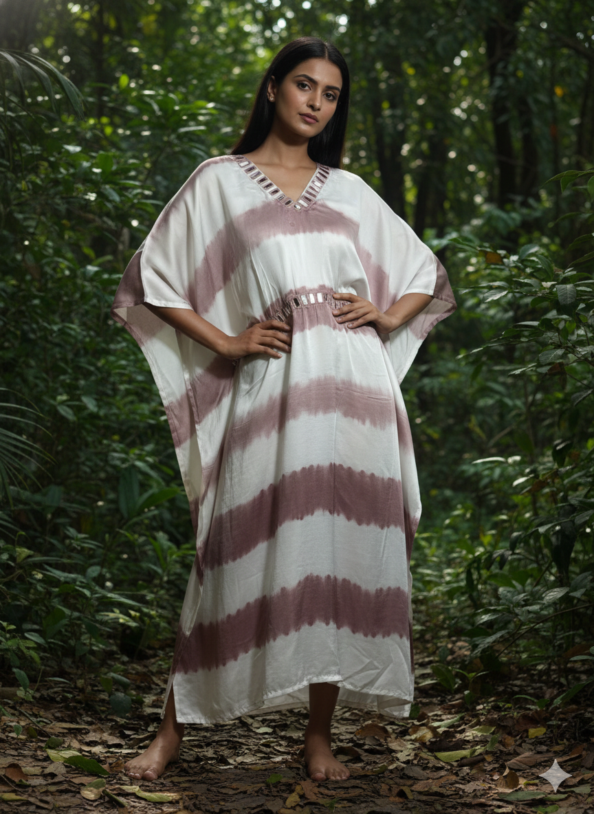 Amp up your festive look with this kaftan dress from Mashas Closet . Tailored from modal in a comfortable fit, this beautiful dress is finished with flared sleeves and a v-neck. And completed with the hand Kutchi mirror work Team it with a pair of heels and exquisite jewellery to complete the look.