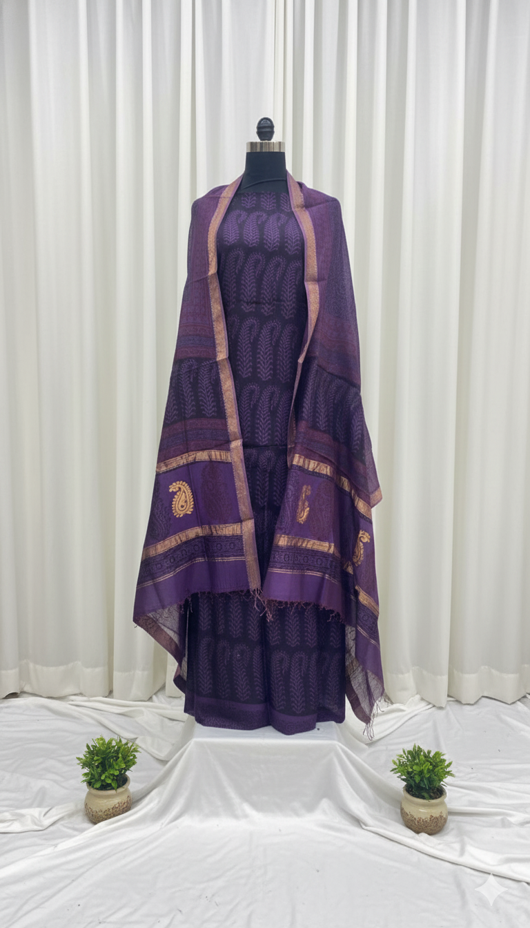 Purple - 3pc Chanderi Silk Bagh handblock Dress Material