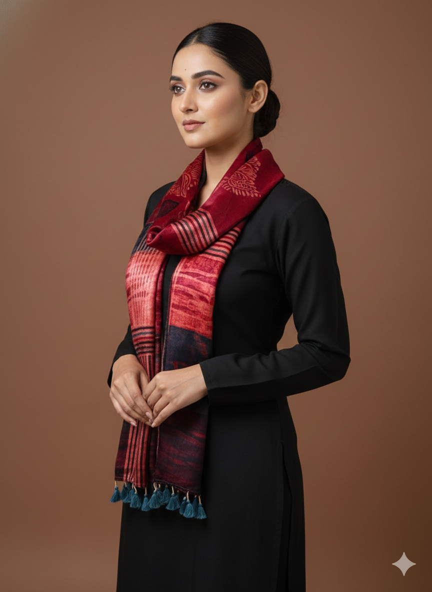 Infuse timeless elegance into your wardrobe with our handcrafted Mashru Silk Ajrakh Stole from the skilled artisans of Kutch, Gujarat. This exquisite piece is crafted with a blend of cotton and silk, offering a soft yet luxurious feel. Created using natural dyes and the traditional Ajrakh block printing technique, it features intricate patterns that celebrate India's rich textile heritage. Perfect for any occasion, this stole combines the opulence of modal silk with unmatched craftsmanship for a truly unique addition to your collection.
