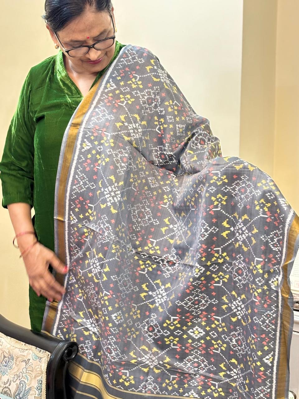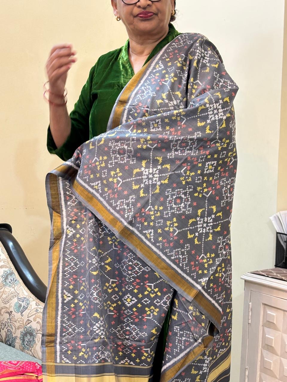 Grey handloom pure mulberry silk  Patola dupatta with geometrical motif