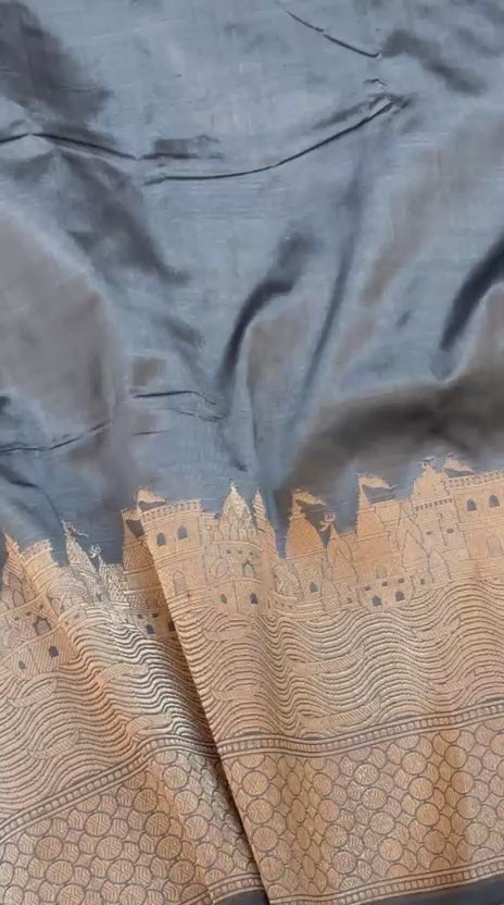 • Speciality - The glorious outline of Varanasi's Ghats, lovingly handwoven on a base of resplendent silk in Roopa Sona or Gold zari. Incredible in its details and a mirror to the splendour of Banaras as seen from the river Ganga.